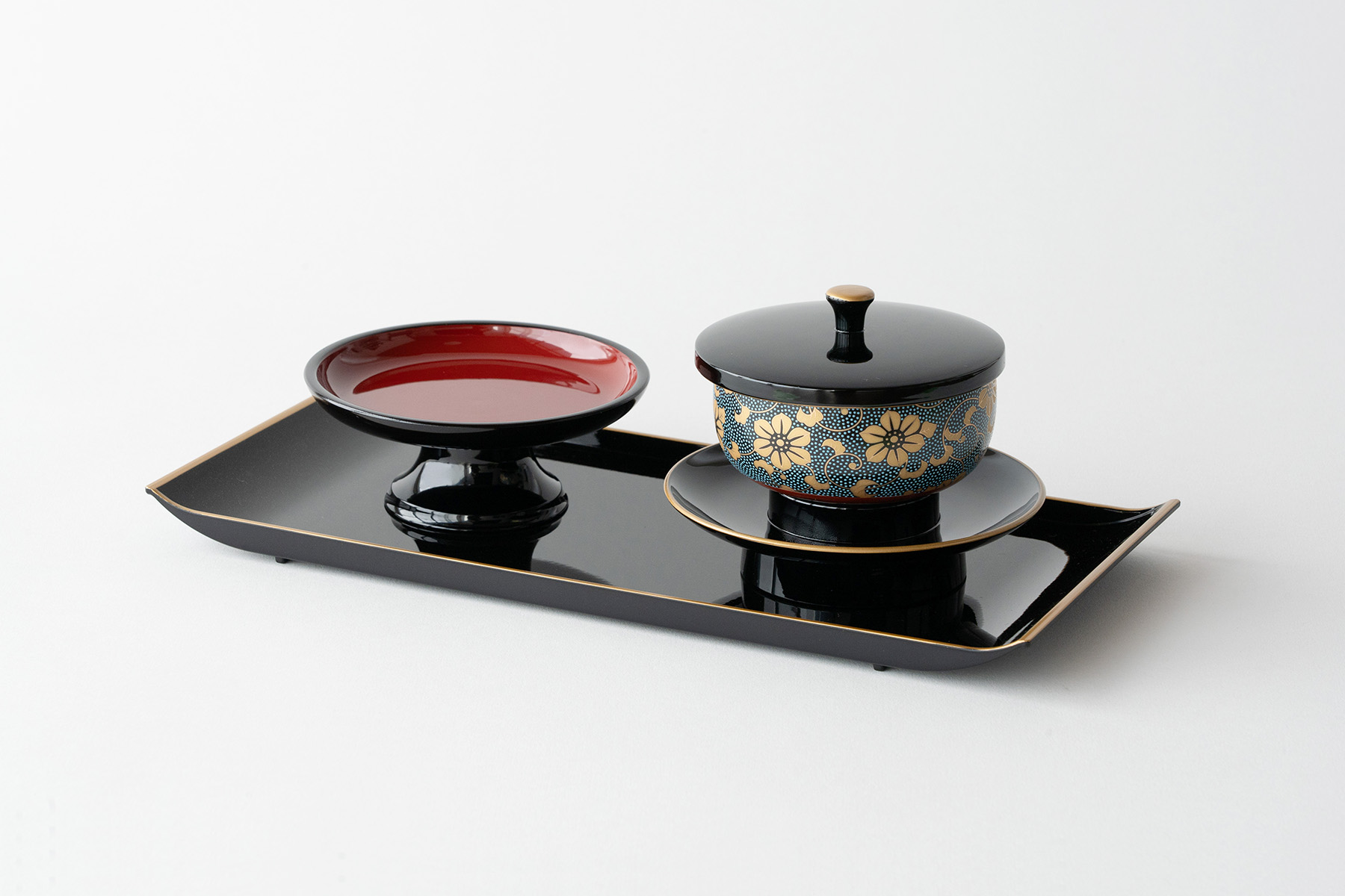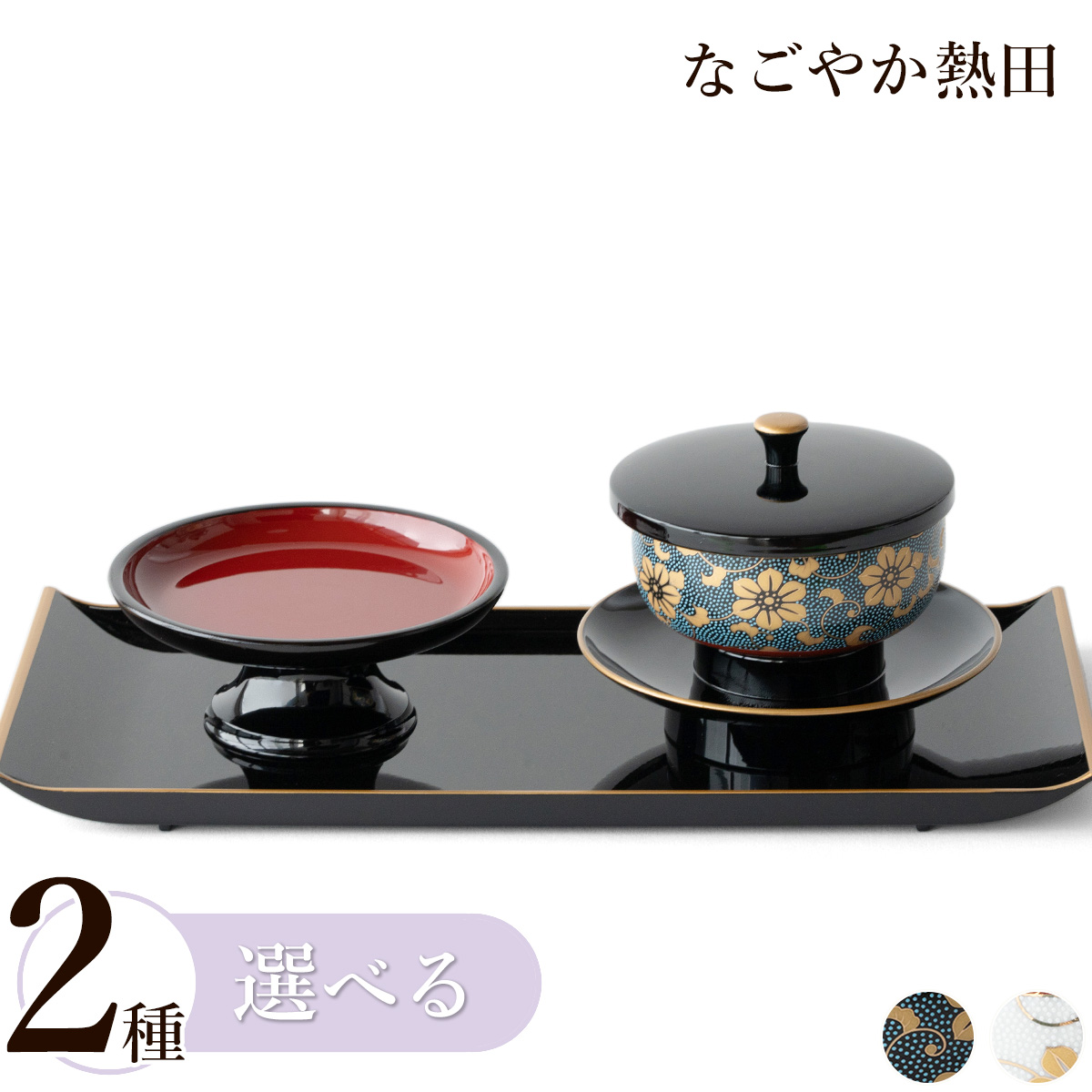 | 艶の塗装が上品な茶托と供物台、滑りにくいよう加工を施した給仕盆。 美しさと機能性を備えたお給仕セット。宗派を問わずご利用いただけます。 |