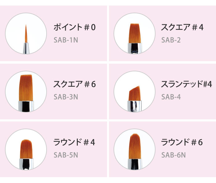 | 備考 | ●スクエア#4(mur-SAB-2N)、スランテッド#4(mur-SAB-4)は在庫がなくなり次第新しい品番に切り替わります。パッケージ等が画像と異なる場合がありますので予めご了承ください。 ●本品をジェルネイルを塗布する以外の目的に使用しないでください。 ●小さなお子様の手の届かない所に保管してください。 ●ジェルをご使用後は必ずジェル用ブラシクリーナー(別売:NPC-1)で洗浄してください。 |