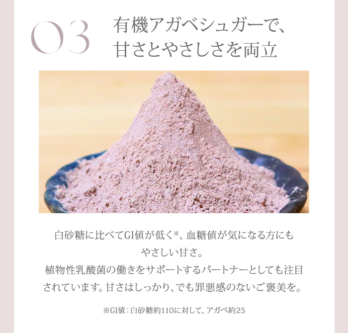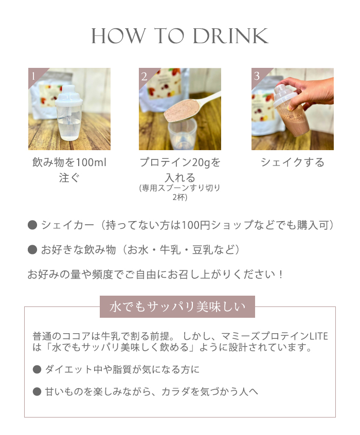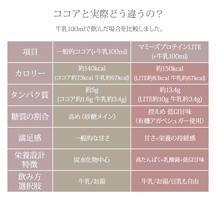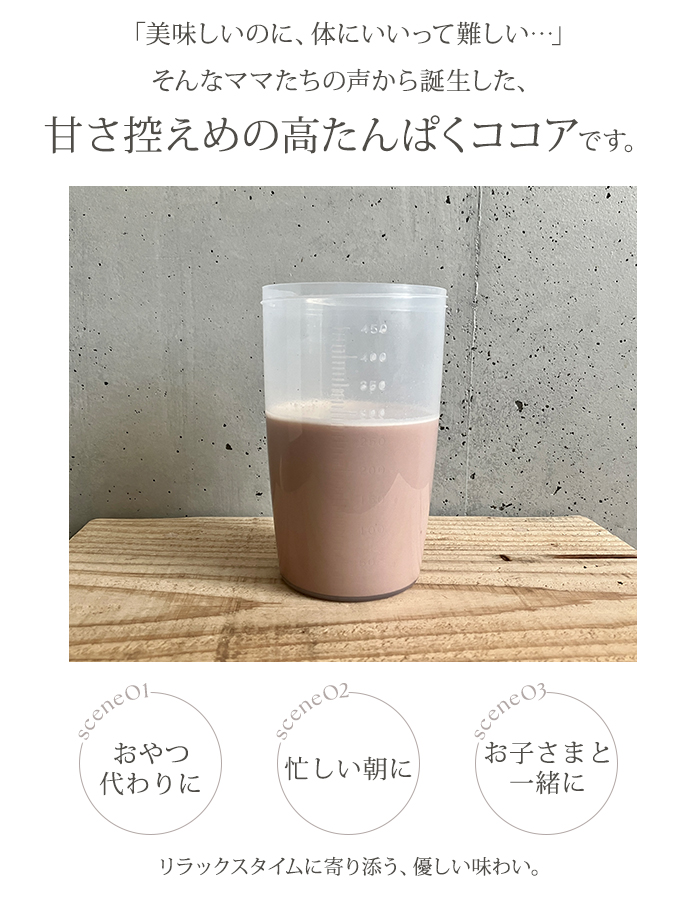 | 原材料 | 乳清たんぱく(アメリカ製造)、有機アガベシュガー、ココアパウダー、植物性乳酸菌(殺菌)、デキストリン / 香料 |