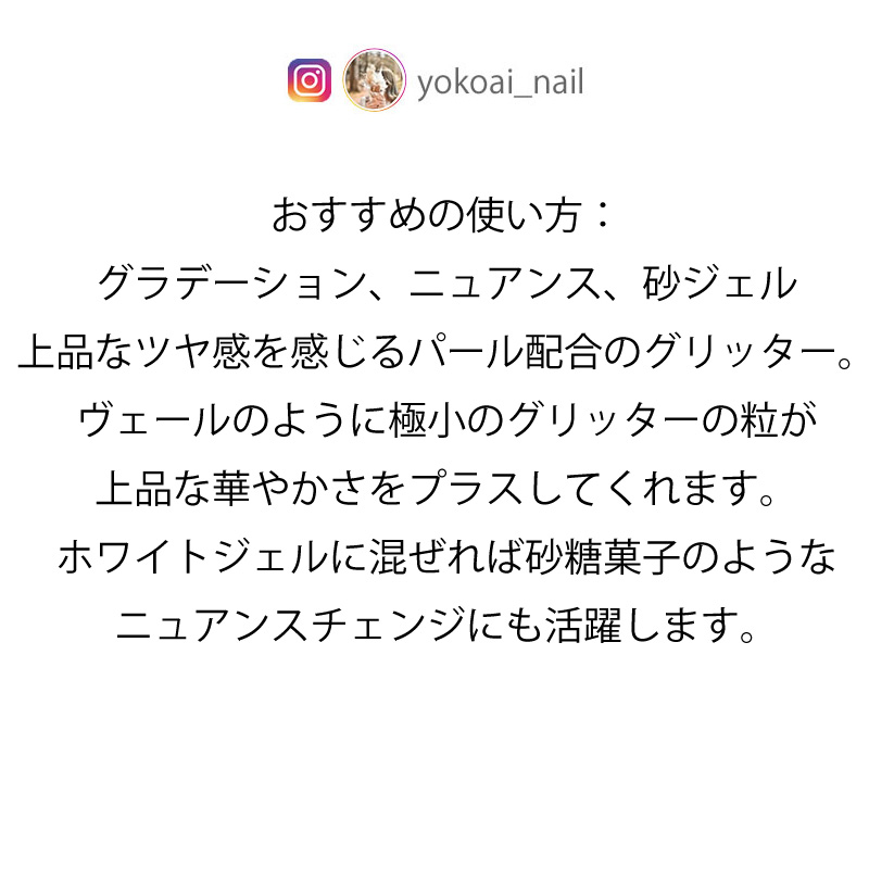 ホワイトジェルに混ぜれば砂糖菓子のようなニュアンスチェンジにも活躍します。