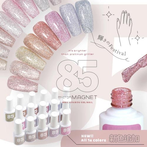 | 輝きのFestival 85micron magnet プラチナラメの輝きを超えた“85micron magnet” 『粗マグ』がボトルタイプになって登場です 反射効果を持ったマグネットパウダーが織り成す眩いパーティー級の賑やかさのマグネットジェルです ●全面マグネットでプラチナ超えのキラキラ感 ●マグネットパウダーを集めて輝きのグラデーション ●粗マグネットが描く筆の軌跡にうっとり どの角度から見ても、指先に視線が釘付けです ■マグネットネイルって??? 使い方は簡単!!塗って磁石を近づけるだけ。 磁石で奥行きを付ける事ができるジェルです。 ■テクスチャー 粒子の荒いマグネットパウダーがギッシリと入っているので重めの印象ですが筆運びが良いジェルです ■商品仕様 全成分:アクリレーツコポリマー、トリメチルベンゾイルジフェニルホスフィンオキシド、HEMA(+/−)、グンジョウ、カーボンブラック、酸化チタン、赤226、黄4、青404、紫201 使用上の注意:ベースジェルの上からご使用ください。爪以外に使用しないで下さい。 硬化時間:LED48W・・・40秒/UV36W・・・120秒 ※塗布量により硬化時間を長く設定して下さい。 ※保管について 品質保持の為、45度以上になる場所での保管はご遠慮下さい 。商品写真はできる限り実物の色に近づけるよう徹底しておりますが、 お使いのモニター設定、お部屋の照明等により実際の商品と色味と異なることがございます。 | |