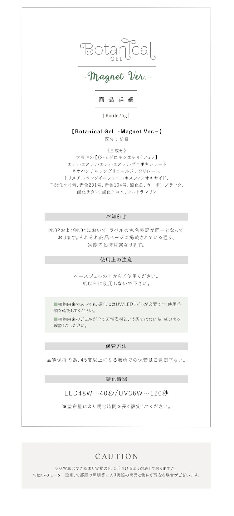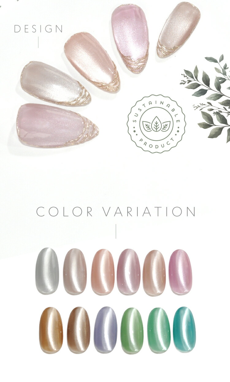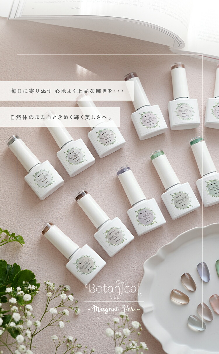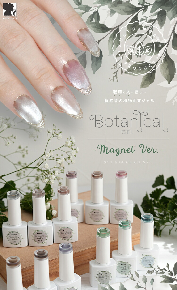 | 環境と人に優しい新感覚の植物由来ジェル 『Botanical Gel』 -Magnet Ver.− 主成分の80%が大豆から抽出された植物由来の樹脂を使用しています 従来の石油由来樹脂とは違い、環境負荷を大幅に軽減しつつ、爪への優しさを追求しました。 環境を大切にした成分で安心しておしゃれを楽しみたい方へ 指先から始めるサステナブル 爪と地球にやさしい選択をしてみませんか? 上質のパールに包まれた様な印象のマグネットネイルです 爪へのやさしさにこだわりながら、マグネットパウダーの輝きが繊細に揺れて、まるで自然の中できらめく光を閉じ込めたようなMagnetNailが実現します 毎日に寄り添う 心地よく上品な輝きを・・・ 自然体のまま心ときめく輝く美しさへ。 ■商品仕様 全成分:大豆油2-【(2-ヒドロキシエチル)アミノ】エチルエステルエチルエステルプロポキシレートネオペンチルレングリコールジアクリレート、トリメチルベンゾイルフェニルホスフィンオキサイド、二酸化ケイ素、赤色201号、赤色104号、酸化鉄、カーボンブラック、酸化チタン、酸化クロム、ウルトラマリン 内容量:5g ■お知らせ No02およびNo04において、ラベルの色名表記が同一となっております。 それぞれ商品ページに掲載されている通り、実際の色味は異なります。 ■使用上の注意 ベースジェルの上からご使用ください。爪以外に使用しないで下さい。 硬化時間:LED48W・・・40秒/UV36W・・・120秒 ※塗布量により硬化時間を長く設定して下さい。 植物由来であっても、硬化にはUV/LEDライトが必要です。使用手順を確認してください。 植物由来のジェルが全て天然素材という訳ではない為、成分表を確認してください。 保管について 品質保持の為、45度以上になる場所での保管はご遠慮下さい。 商品写真はできる限り実物の色に近づけるよう徹底しておりますが、 お使いのモニター設定、お部屋の照明等により実際の商品と色味が異なる場合がございます。 白いボトルを採用しています。塗装不良の黒い点などがありますが、ジェルに問題はありませんので、良品として出荷します。 | |