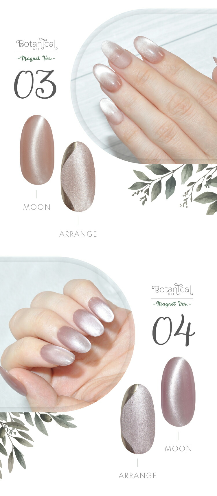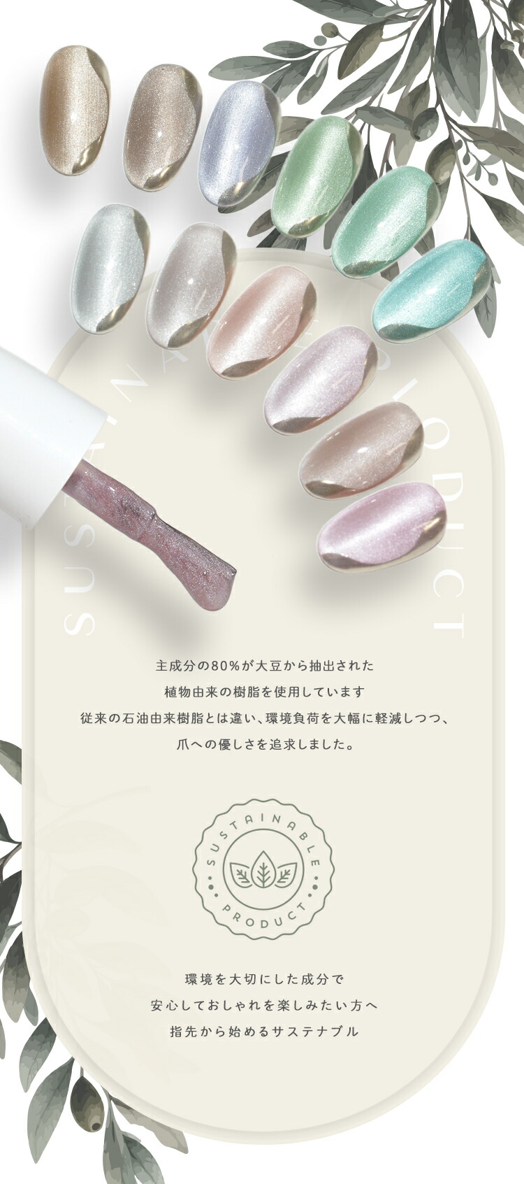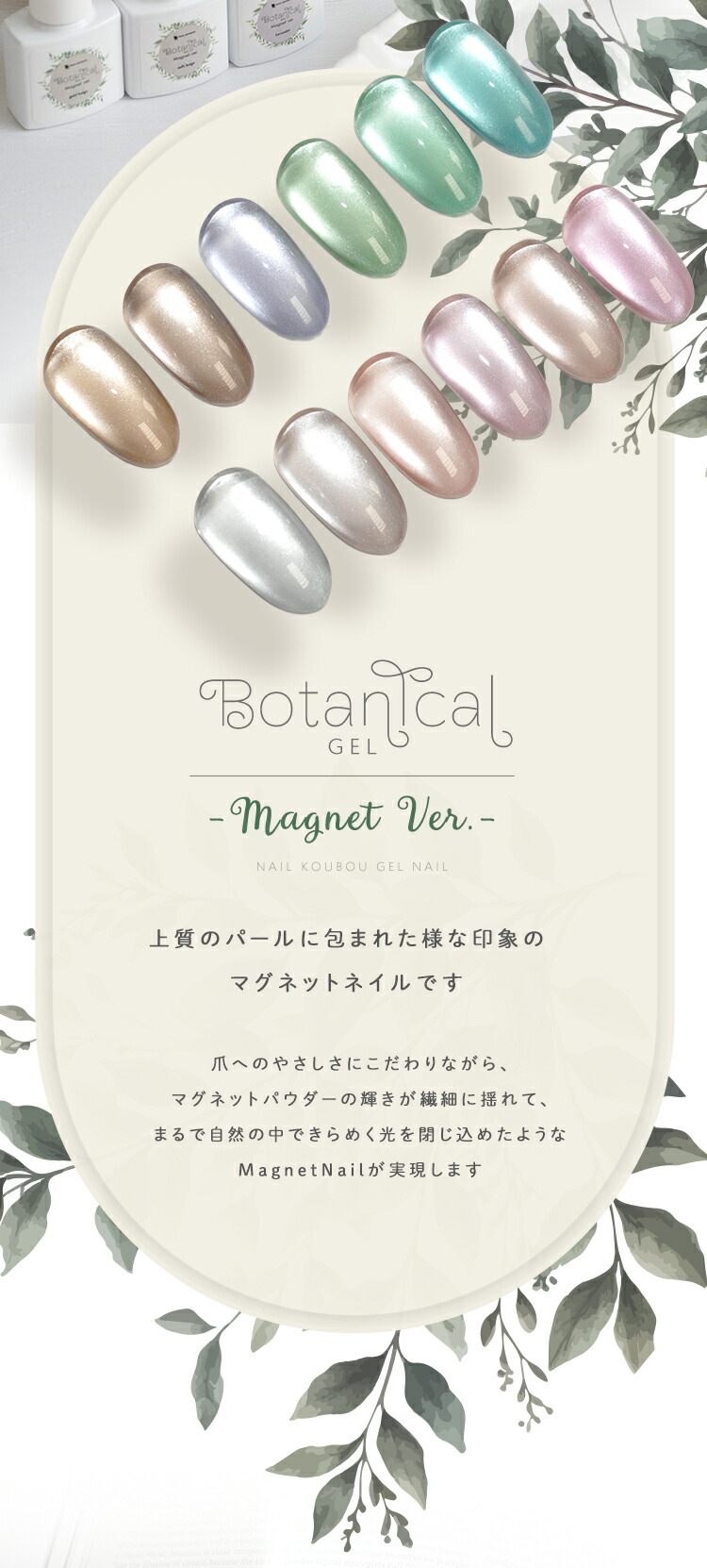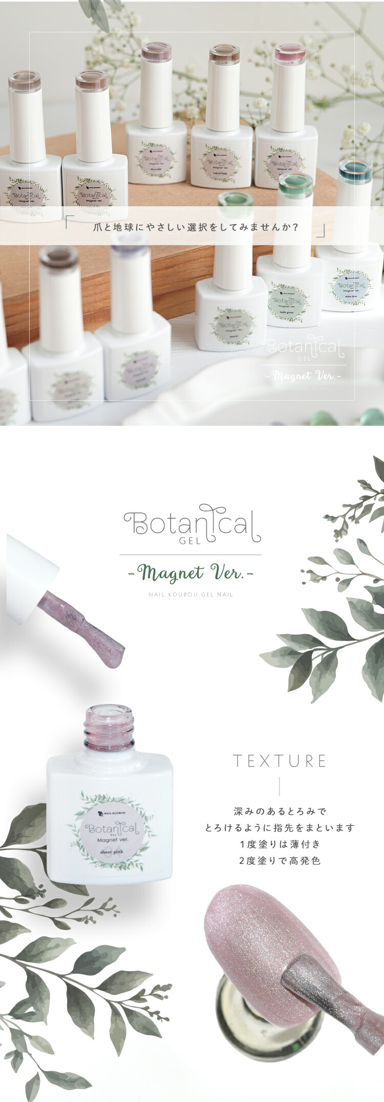 | 環境と人に優しい新感覚の植物由来ジェル 『Botanical Gel』 -Magnet Ver.− 主成分の80%が大豆から抽出された植物由来の樹脂を使用しています 従来の石油由来樹脂とは違い、環境負荷を大幅に軽減しつつ、爪への優しさを追求しました。 環境を大切にした成分で安心しておしゃれを楽しみたい方へ 指先から始めるサステナブル 爪と地球にやさしい選択をしてみませんか? 上質のパールに包まれた様な印象のマグネットネイルです 爪へのやさしさにこだわりながら、マグネットパウダーの輝きが繊細に揺れて、まるで自然の中できらめく光を閉じ込めたようなMagnetNailが実現します 毎日に寄り添う 心地よく上品な輝きを・・・ 自然体のまま心ときめく輝く美しさへ。 ■商品仕様 全成分:大豆油2-【(2-ヒドロキシエチル)アミノ】エチルエステルエチルエステルプロポキシレートネオペンチルレングリコールジアクリレート、トリメチルベンゾイルフェニルホスフィンオキサイド、二酸化ケイ素、赤色201号、赤色104号、酸化鉄、カーボンブラック、酸化チタン、酸化クロム、ウルトラマリン 内容量:5g ■お知らせ No02およびNo04において、ラベルの色名表記が同一となっております。 それぞれ商品ページに掲載されている通り、実際の色味は異なります。 ■使用上の注意 ベースジェルの上からご使用ください。爪以外に使用しないで下さい。 硬化時間:LED48W・・・40秒/UV36W・・・120秒 ※塗布量により硬化時間を長く設定して下さい。 植物由来であっても、硬化にはUV/LEDライトが必要です。使用手順を確認してください。 植物由来のジェルが全て天然素材という訳ではない為、成分表を確認してください。 保管について 品質保持の為、45度以上になる場所での保管はご遠慮下さい。 商品写真はできる限り実物の色に近づけるよう徹底しておりますが、 お使いのモニター設定、お部屋の照明等により実際の商品と色味が異なる場合がございます。 白いボトルを採用しています。塗装不良の黒い点などがありますが、ジェルに問題はありませんので、良品として出荷します。 | |