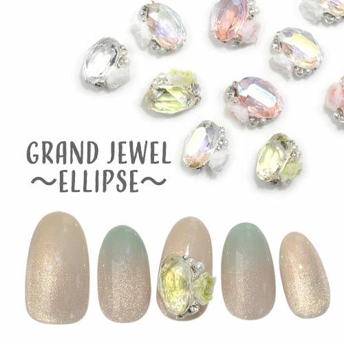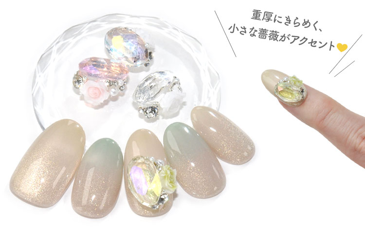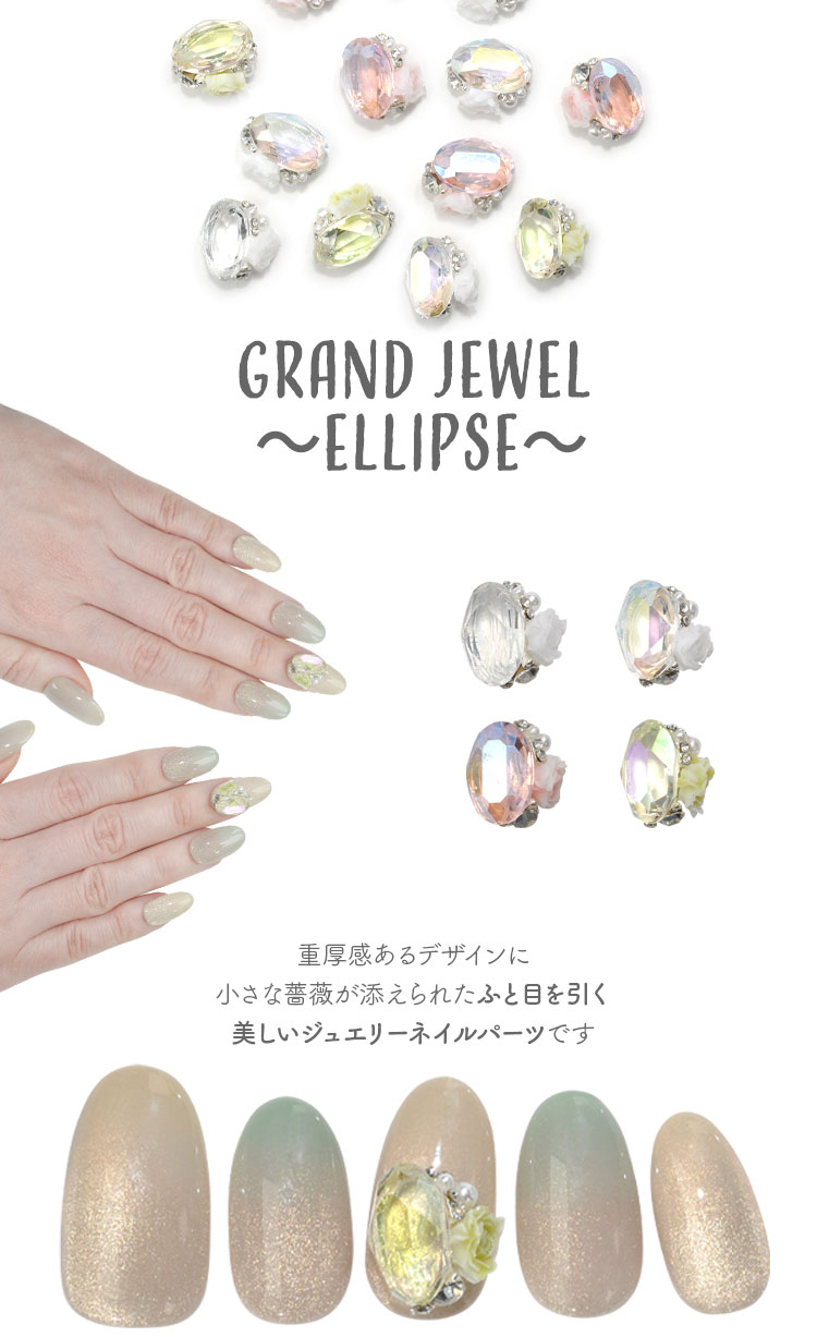 Grand Jewel 〜ellipse〜 薔薇の余韻重厚感あるデザインに、ストーンと小さな薔薇が添えられたふと目を引く美しいネイルパーツです。 ハード&フェミニンを両立する、他にはないネイルパーツです 重厚にきらめく、小さな薔薇がアクセント |