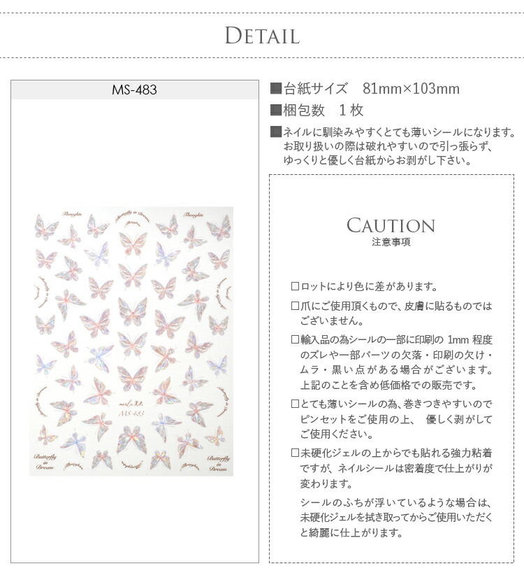 | ・ロットにより色に差がございます。 ・爪にご使用頂くもので、皮膚に貼るものではございません。 ・輸入品の為シールの一部に印刷の1mm程度のズレや一部パーツの欠落・印刷の欠け・ムラ・黒い点がある場合がございます。上記のことを含め低価格での販売です。 ・とても薄いシールの為、巻きつきやすいのでピンセットをご使用の上、優しく剥がしてご使用ください。 ・未硬化ジェルの上からでも貼れる強力粘着ですが、ネイルシールは密着度で仕上がりが変わります。シールのふちが浮いているような場合は、未硬化ジェルを拭き取ってからご使用いただくと綺麗に仕上がります | |