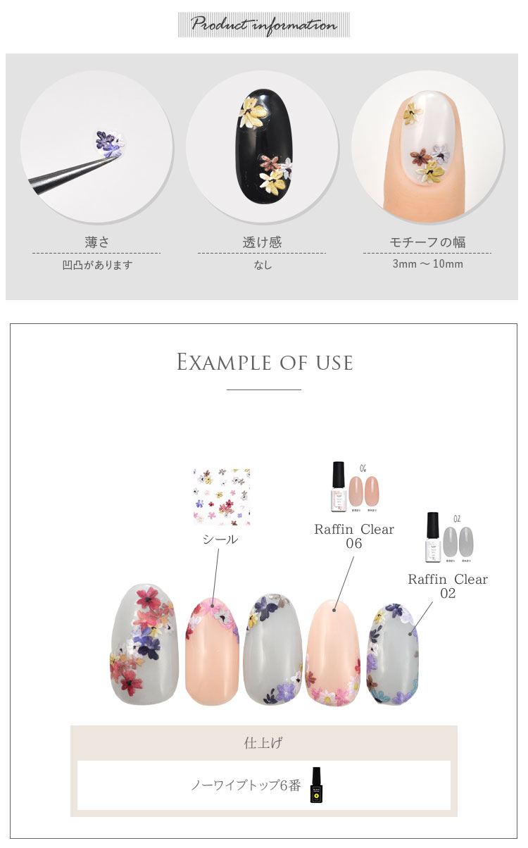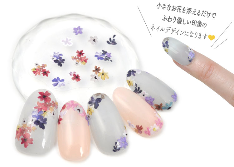 | floral memories 指先に咲く小さな花園 自然に咲いているお花を摘み取り押し花にした様な小さなお花のネイルシールです 小さなお花を添えるだけでふわり優しい印象のネイルデザインになります-------------------------------------- 薄さ:凹凸があります 透け感:なし モチーフの幅:3mm〜10mm | |
