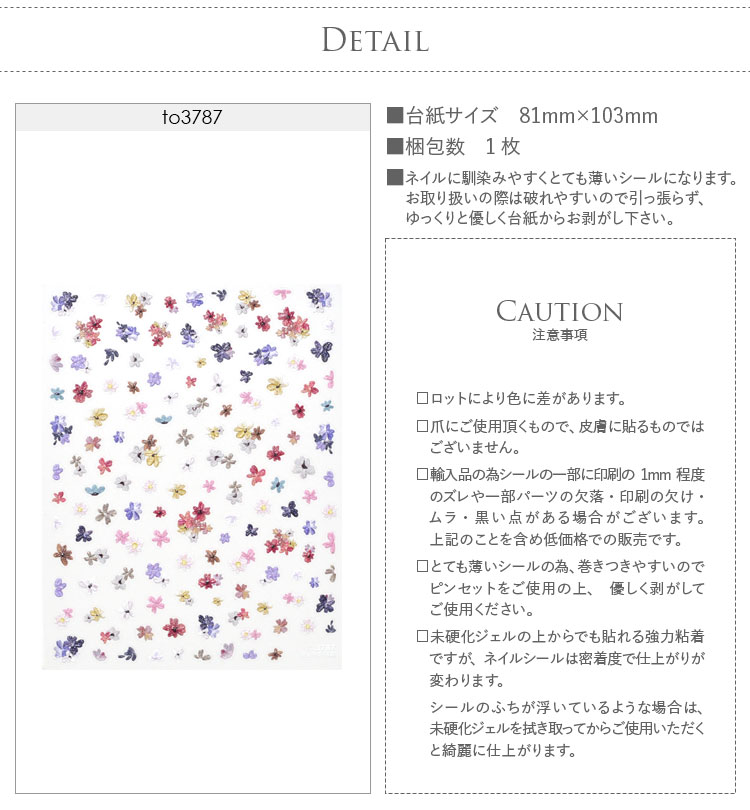 | ・ロットにより色に差がございます。 ・爪にご使用頂くもので、皮膚に貼るものではございません。 ・輸入品の為シールの一部に印刷の1mm程度のズレや一部パーツの欠落・印刷の欠け・ムラ・黒い点がある場合がございます。上記のことを含め低価格での販売です。 ・とても薄いシールの為、巻きつきやすいのでピンセットをご使用の上、優しく剥がしてご使用ください。 ・未硬化ジェルの上からでも貼れる強力粘着ですが、ネイルシールは密着度で仕上がりが変わります。シールのふちが浮いているような場合は、未硬化ジェルを拭き取ってからご使用いただくと綺麗に仕上がります | |
