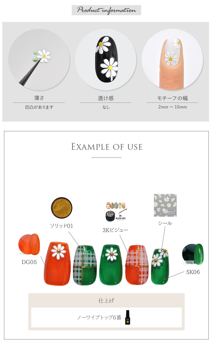 | DAISY Flower 妖精のティアラ シンプルで可憐な白い花びらと黄色い中心が特徴的です 清楚で爽やかで可愛らしい雰囲気にピッタリの1枚です ひとつのお花だけで可愛らしさ全開 -------------------------------------- 薄さ:凹凸があります 透け感:なし モチーフの幅:2mm〜10mm | |