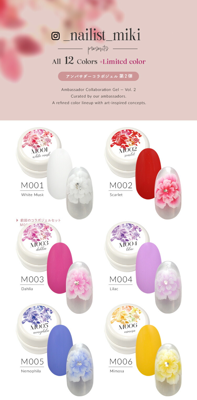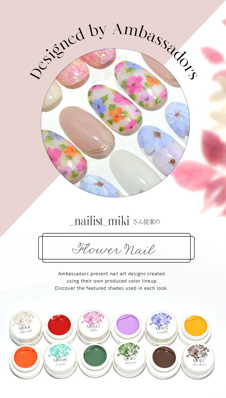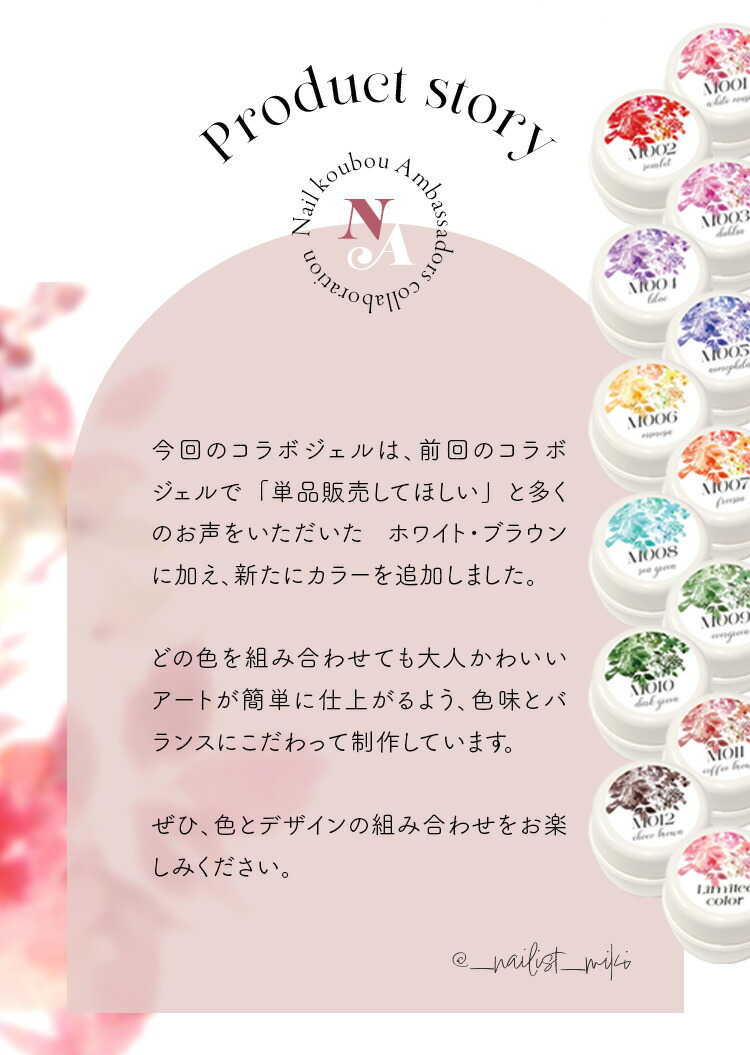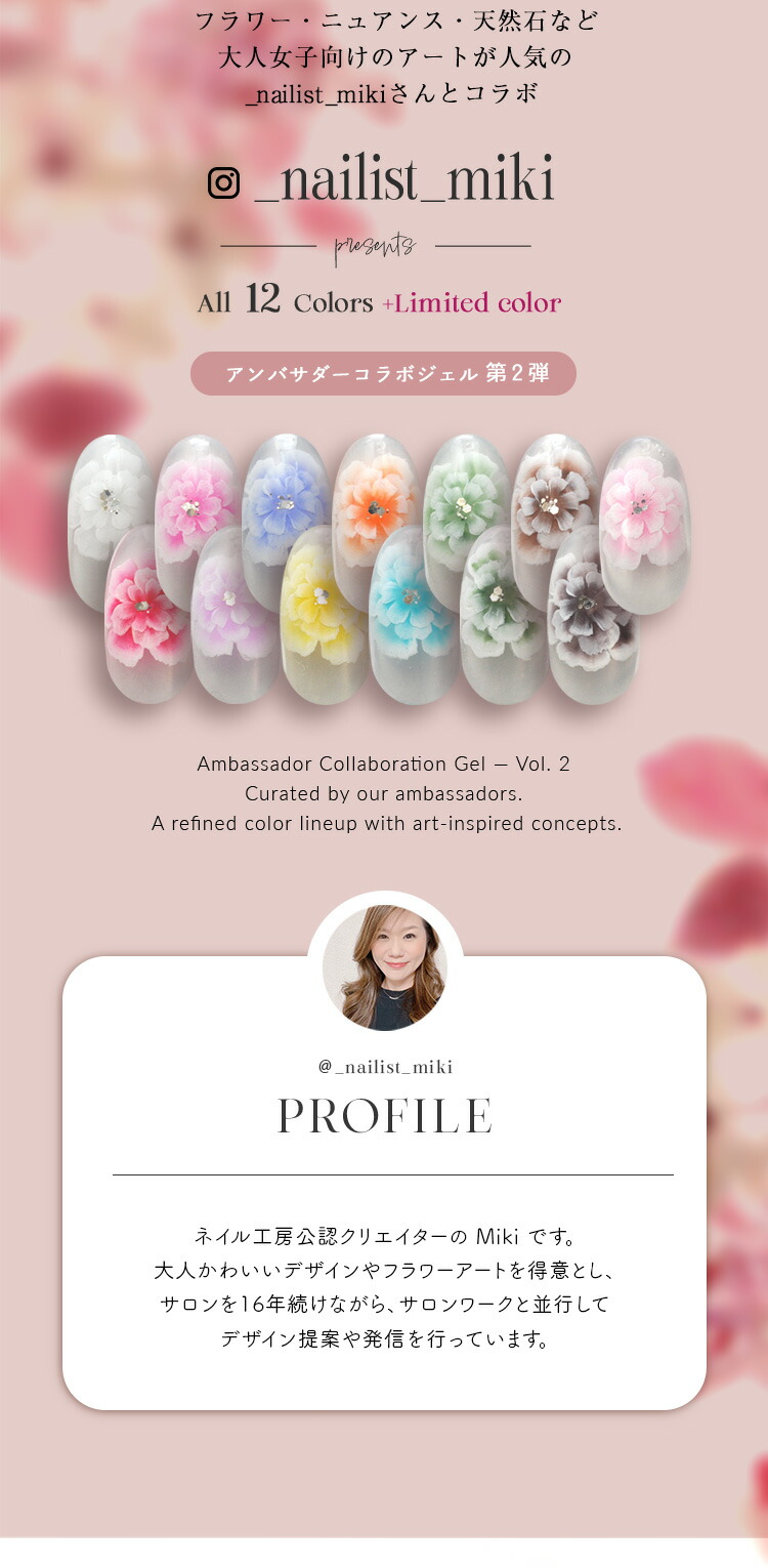 | アンバサダーコラボジェル ネイル工房×Ambassador企画 “第2弾” フラワー・ニュアンス・天然石など大人女子向けのアートが人気の_nailist_mikiさんとコラボ ■Profile こんにちは! ネイル工房公認クリエイターの Miki です。 大人かわいいデザインやフラワーアートを得意とし、サロンを16年続けながら、サロンワークと並行してデザイン提案や発信を行っています。 ■Product story 今回のコラボジェルは、前回のコラボジェルで 「単品販売してほしい」 と多くのお声をいただいた ホワイト・ブラウン に加え、新たにカラーを追加しました。 どの色を組み合わせても大人かわいいアートが簡単に仕上がるよう、色味とバランスにこだわって制作しています。 ぜひ、色とデザインの組み合わせをお楽しみください。 @_nailist_miki | |