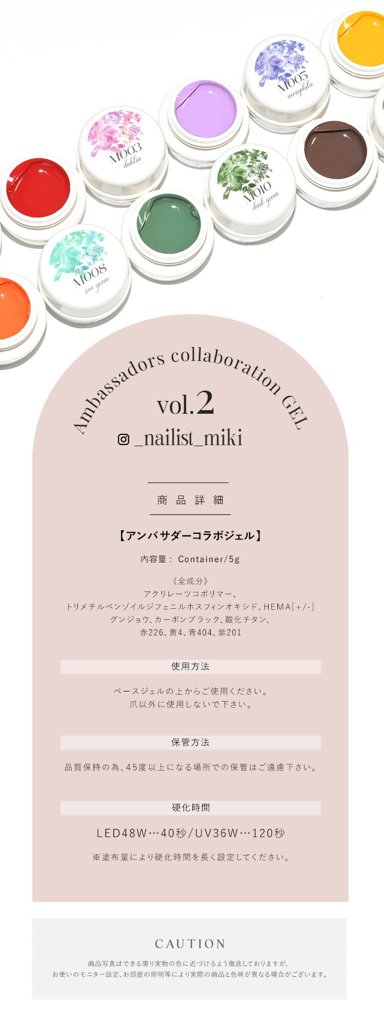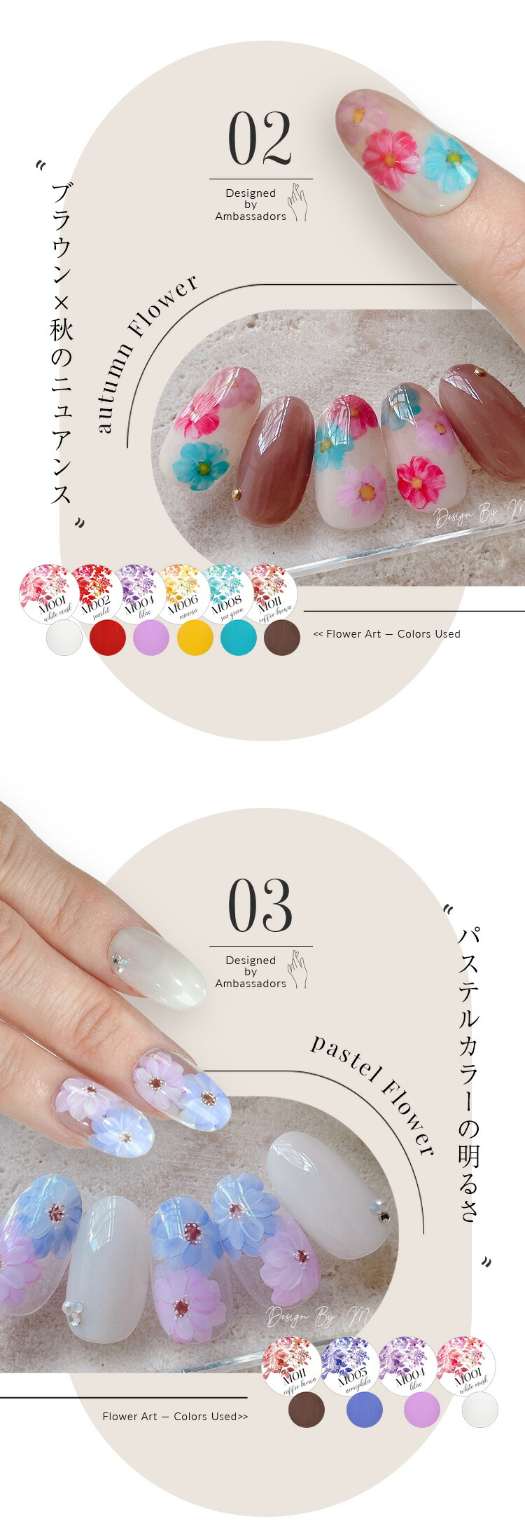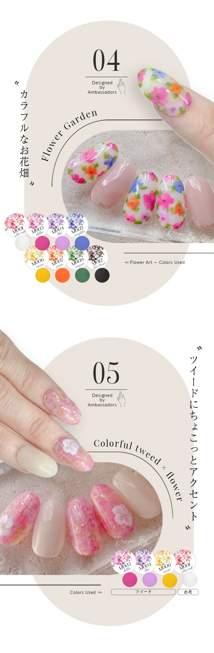 | アンバサダーコラボジェル ネイル工房×Ambassador企画 “第2弾” フラワー・ニュアンス・天然石など大人女子向けのアートが人気の_nailist_mikiさんとコラボ ■Profile こんにちは! ネイル工房公認クリエイターの Miki です。 大人かわいいデザインやフラワーアートを得意とし、サロンを16年続けながら、サロンワークと並行してデザイン提案や発信を行っています。 ■Product story 今回のコラボジェルは、前回のコラボジェルで 「単品販売してほしい」 と多くのお声をいただいた ホワイト・ブラウン に加え、新たにカラーを追加しました。 どの色を組み合わせても大人かわいいアートが簡単に仕上がるよう、色味とバランスにこだわって制作しています。 ぜひ、色とデザインの組み合わせをお楽しみください。 @_nailist_miki | |