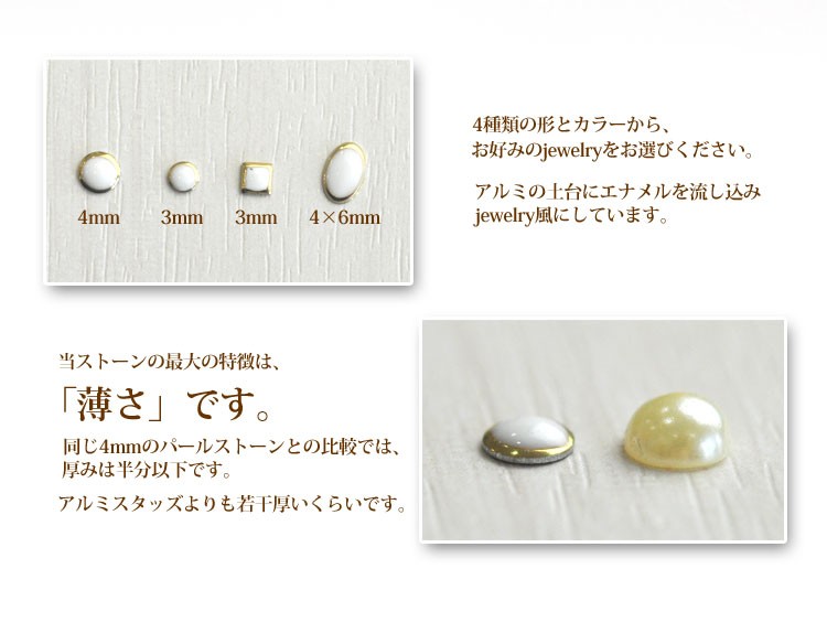 | ジェルネイルへの埋め込みが楽々♪厚みを抑えたフラットタイプのみ取り揃えました。 アルミ×エナメル製なので、とても軽く付けている感じがありません。 | |