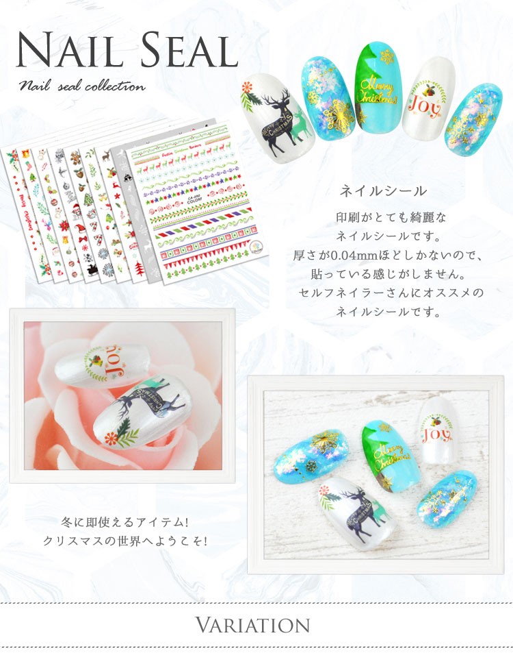 印刷がとても綺麗なネイルシールです。厚さが0.04mmほどしかないので、貼っている感じがしません。セルフネイラーさんにオススメのネイルシールです。 冬に即使えるアイテム!クリスマスの世界へようこそ!