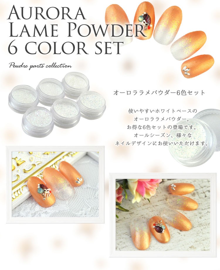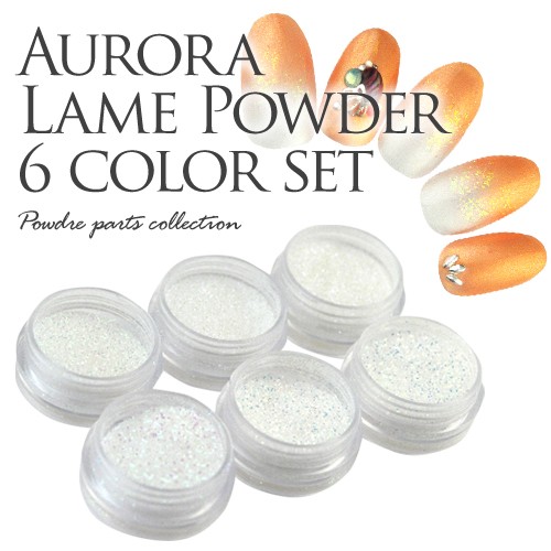 | 使いやすいホワイトベースのオーロララメパウダー。 お得な6色セットの登場です。 オールシーズン、様々なネイルデザインにお使いいただけます。 | |