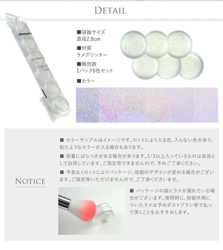 | ※カラーサンプルはイメージです。入る色、入らない色があり、似たようなカラーが入る場合もあります。 ※容量にばらつきがある場合があります。1/3以上入っているものは良品として出荷しています。 ※予告なくロットによりパッケージ、容器のデザインが変わる場合がございます。 ご指定等いただけませんので、ご了承くださいませ。 ※パッケージの袋にラメが漏れている場合がございます。 使用時に、容器外側についたラメは予めダストブラシ等で払って頂くことをおすすめします。 | |