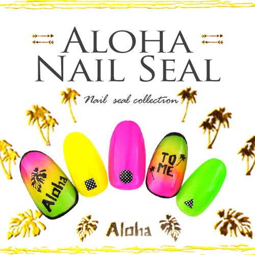 | ハワイの雰囲気を出したいならこのネイルシールがオススメ。ハワイの言葉や、ヤシの木、葉、ウッドデザインが入っています。サンプルでは個性的なネオンカラーグラデーションで作りましたが、パステルカラーにも良く合うデザインです。 | |