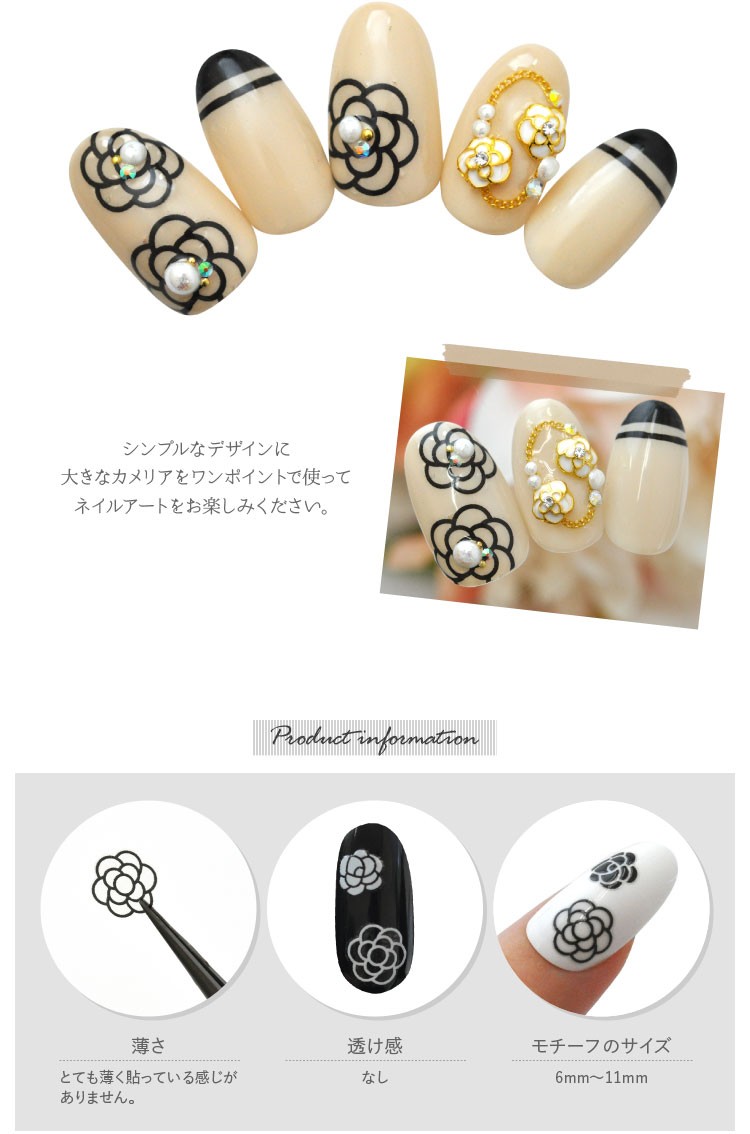 | カメリア(Camelia) くり貫きののカメリアとマットなカメリアがセットになったネイルシールです。 ナチュラルなカラーにもよく合います。 シンプルなデザインに大きなカメリアをワンポイントで使ってネイルアートをお楽しみください。 -------------------------------------- 薄さ:とても薄く貼っている感じがありません。 透け感:なし モチーフのサイズ:6mm〜11mm | |
