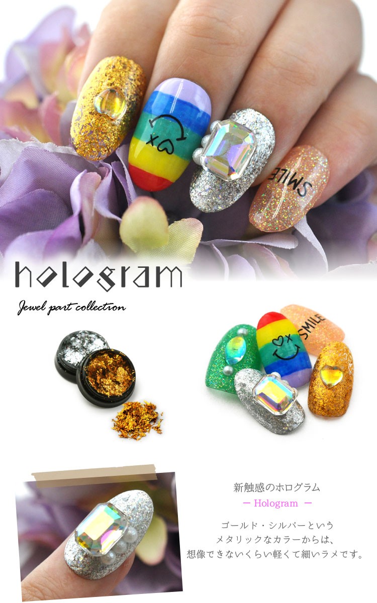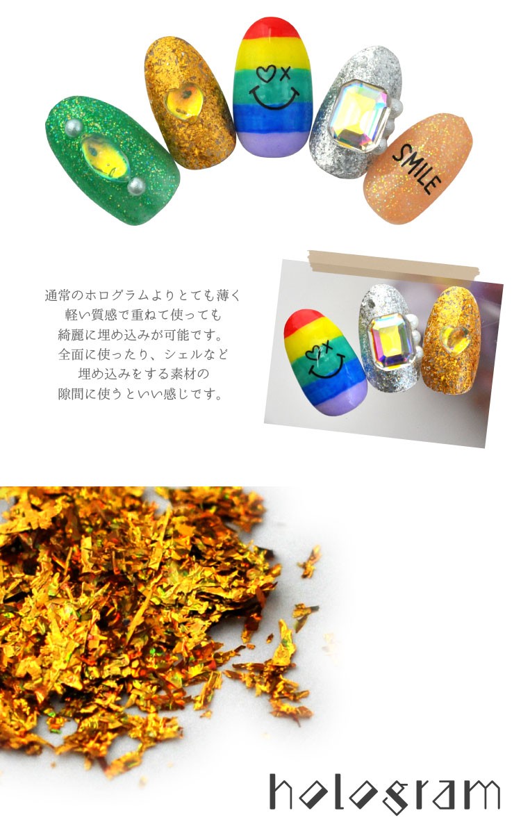 | 新触感のホログラム(hologram) ゴールド・シルバーというメタリックなカラーからは、 想像できないくらい軽くて細いラメです。 通常のホログラムよりとても薄く軽い質感で重ねて使っても綺麗に埋め込みが可能です。 全面に使ったり、シェルなど埋め込みをする素材の隙間に使うといい感じです。 | |