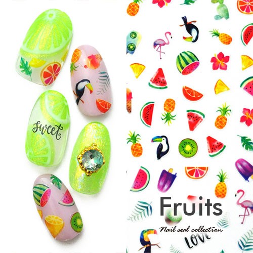 | フルーツのネイルシール(Fruits) いろいろなフルーツを集めたネイルシールです。 水彩タッチのかわいらしいデザインのフルーツネイルをお楽しみください。 葉や九官鳥もセットになっているので、南国ネイルアートもできますよ。 -------------------------------------- 薄さ:とても薄く貼っている感じがありません。 透け感:なし モチーフのサイズ:4mm〜9mm | |