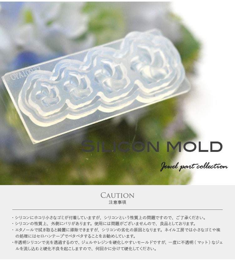 | ・シリコンにホコリ小さなゴミが付着していますが、シリコンという性質上の問題ですので、ご了承ください。 ・シリコンの性質上、外側にバリがあります。使用には問題がございませんので、良品としております。 ・エタノールで拭き取ると綺麗に掃除できますが、シリコンの劣化の原因となります。 ネイル工房では小さなゴミや埃の処理にはセロハンテープでペタペタすることをお勧めしています。 ・半透明シリコンで光を透過するので、ジェルやレジンを硬化しやすいモールドですが、一度に不透明(マット)なジェルを流し込むと硬化不良を起こしますので、何回かに分けて硬化してください。 | |