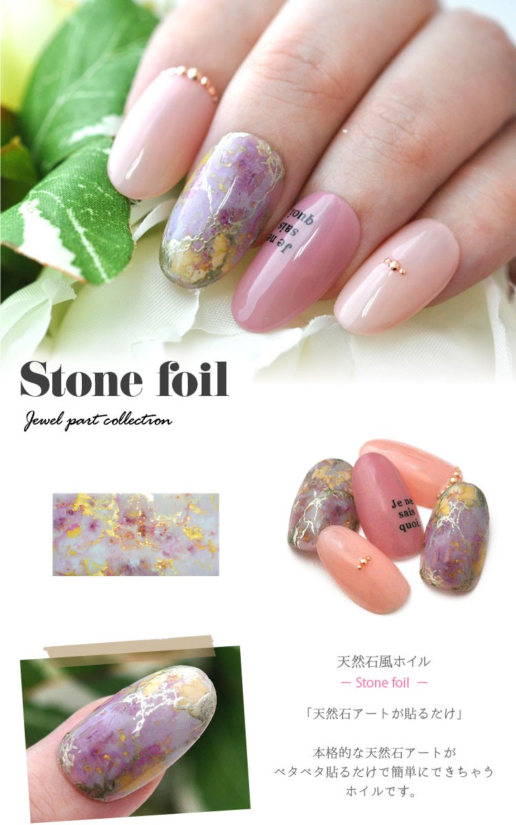 | 天然石風ホイル(stone foil) 「天然石アートが貼るだけ」 本格的な天然石アートがペタペタ貼るだけで簡単にできちゃうホイルです。 サンプルチップはホイルを貼った後に、メタリックジェルでラインをプラスしてリアル感を増しています。 | |