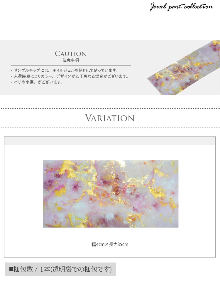 | ・サンプルチップには、ホイルジェルを使用して貼っています。 ・入荷時期によりカラー、デザインが若干異なる場合がございます。 ・バリや小傷、がございます。 | |