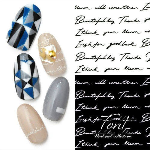 | 文字ネイルシール(Font) 「手描きの手紙」 手紙のような筆記体の文字ネイルシールです。 ブラックとホワイトからお選びいただけます。 サンプルチップでは、合わせ使いでチップ全体を文字で模様のようにデザインしてみました。 -------------------------------------- 薄さ:とても薄く貼っている感じがありません。 透け感:なし 文字:幅6mm〜12mm | |