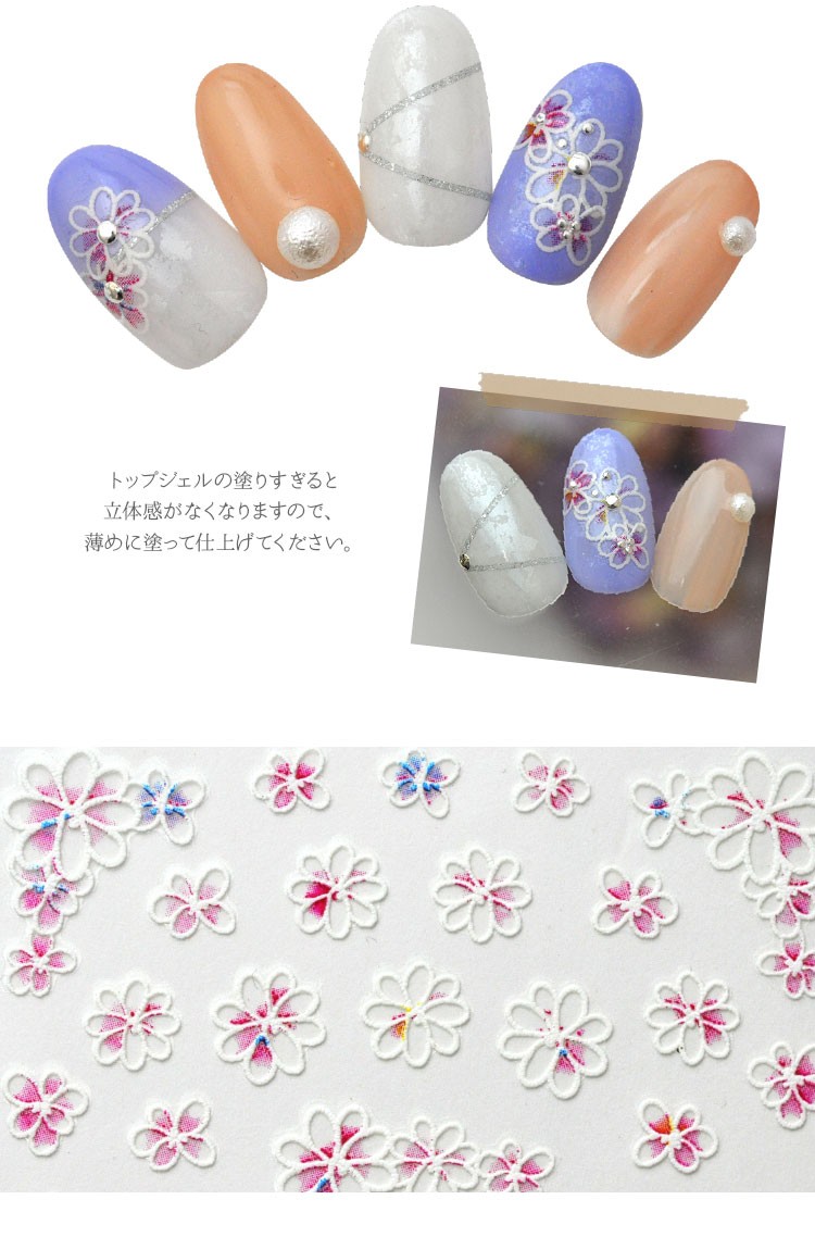| 3Dネイルシール(3D flower) 「フラワーの3Dネイルシール」 カラフルなフラワーの3Dネイルシールです。 カラージェルで2回重ねて塗布したくらいの立体感です。 トップジェルの塗りすぎると立体感がなくなりますので、薄めに塗って仕上げてください。 -------------------------------------- 薄さ:とても薄く貼っている感じがありません。 透け感:なし モチーフ:幅6mm〜18mm | |
