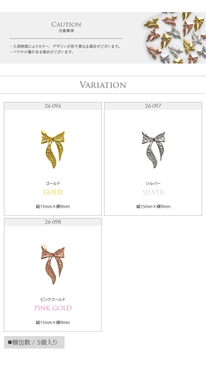 メタルパーツ リボン ネイルパーツ ( ゴールド / シルバー ピンク ) リボンパーツ5個 | ジェルネイル ネイ