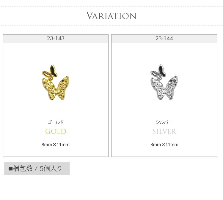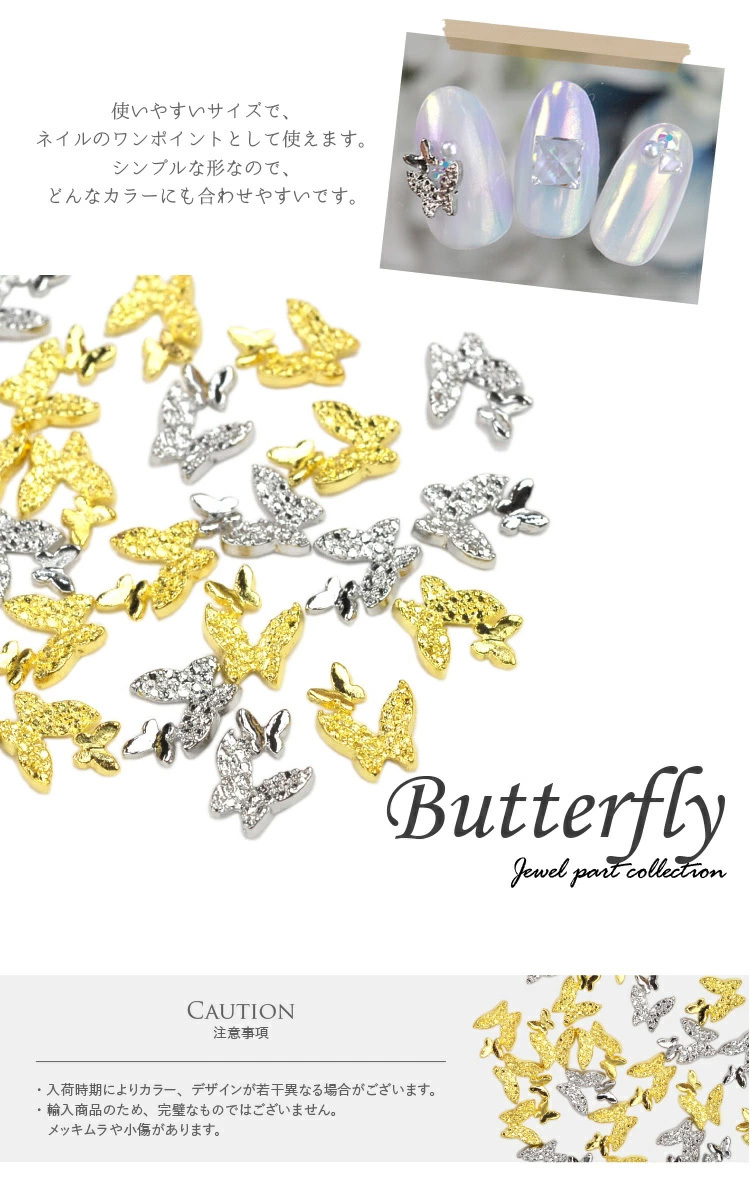 蝶々(Butterfly) 「羽ばたく蝶々」 繊細な模様のついた大きな蝶々と、ノーマルな小さな蝶々がセットになったパーツです。 使いやすいサイズで、ネイルのワンポイントとして使えます。 シンプルな形なので、どんなカラーにも合わせやすいです。 |