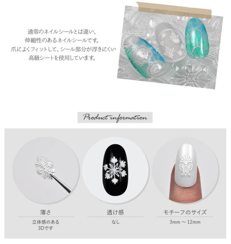 | 3Dレース(3D lace) 「立体で柔らかいレースシール」 カギ編みで丁寧に仕上げたレースのような3Dシールです。 シールを組み合わせて模様を作っても素敵です。 通常のネイルシールとは違い、伸縮性のあるネイルシールです。 爪によくフィットして、シール部分が浮きにくい高級シートを使用しています。 -------------------------------------- 薄さ:立体感のある3Dです 透け感:なし モチーフのサイズ:3mm〜12mm | |