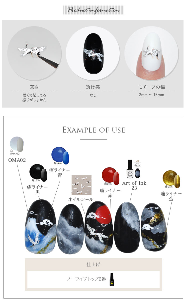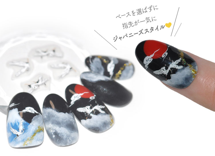 | CRANE ザ・ジャパニーズばーど 羽を広げて舞っている可憐な姿が美しい和テイストのシール ベースを選ばずに指先が一気にジャパニーズスタイル -------------------------------------- 薄さ:薄くて貼ってる感じがしません 透け感:なし モチーフの幅:2mm〜15mm | |