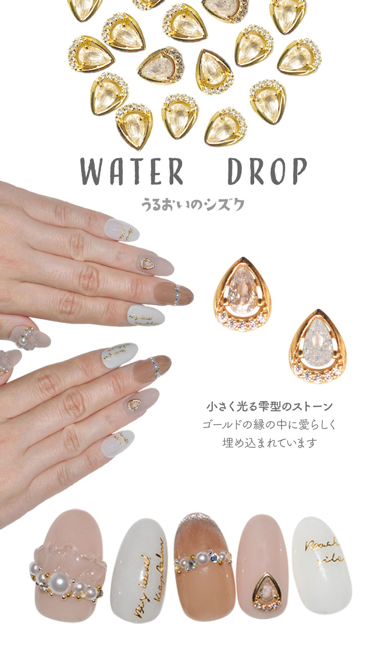| WATER DROP うるおいのシズク 小さく光る雫型のストーン ゴールドの縁の中に愛らしく埋め込まれています ピンクベージュのベースにシンプルにひと雫だけのせました エレガントな印象に | |