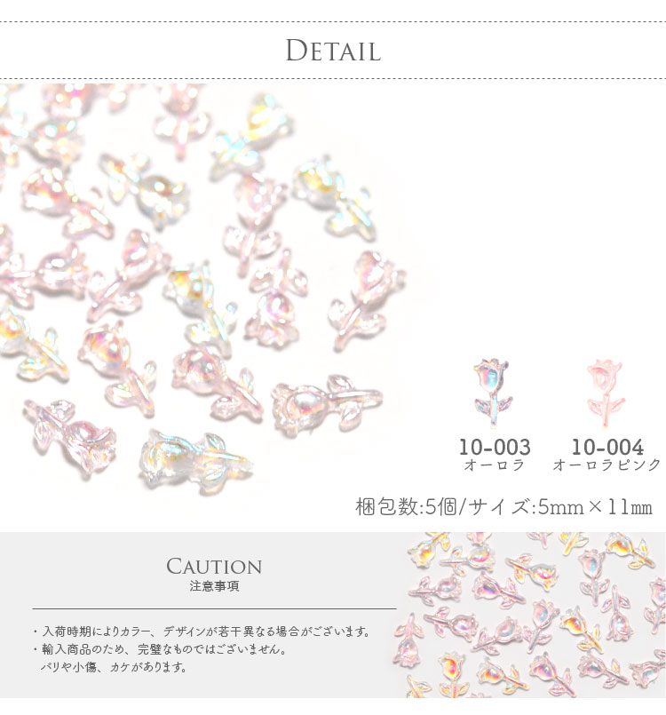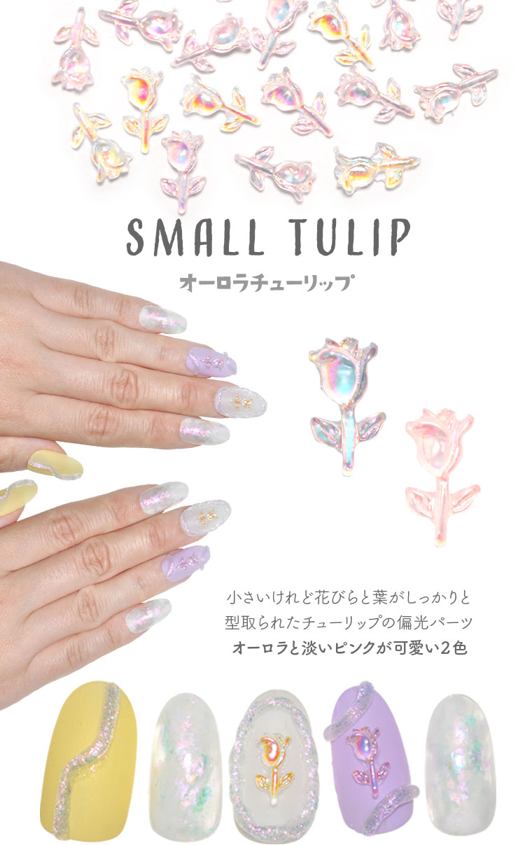 | small tulip オーロラチューリップ 小さいけれど花びらと葉がしっかりと型取られたチューリップの偏光パーツ オーロラと淡いピンクが可愛い2色 ベースとゼリージェルでも偏光を作り出しパーツをのせても色が浮かないように一体感を出した仕上がりに | |