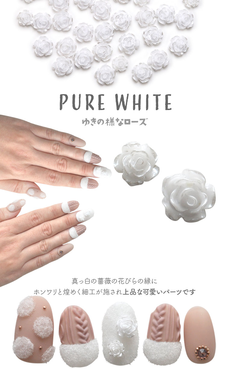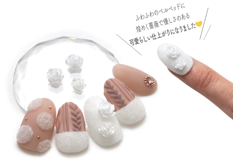 | pure white 眠り姫 真っ白の薔薇の花びらの縁にホンワリと煌めく細工が施され上品な可愛いパーツです ふわふわのベルベッドに煌めく薔薇で優しさのある可愛らしい仕上がりになりました | |