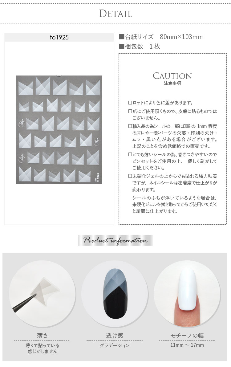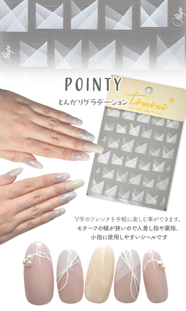 | Pointy とんがりグラデーション V字のフレンチを手軽に楽しむ事ができます。 モチーフの幅が狭いので人差し指や薬指、小指に使用しやすいシールです。 ほんのり広がるホワイトのV字フレンチを優しい印象に仕上げました --------------------------------------- 薄さ:薄くて貼っている感じがしません 透け感:グラデーション モチーフの幅:11mm〜17mm | |