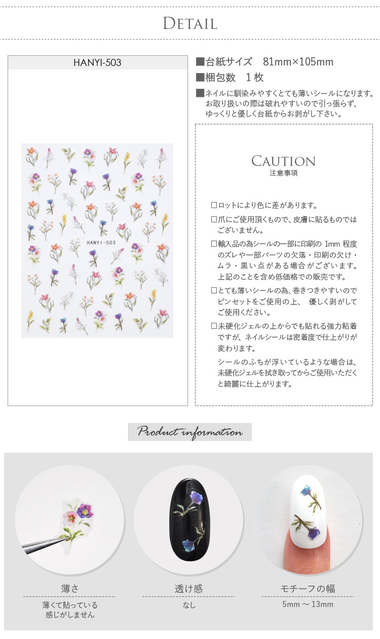 | ・ロットにより色に差があります。 ・・輸入品の為シールの一部に印刷の1mm程度のズレや一部パーツの欠落・印刷の欠け・ムラ・黒い点がある場合がございます。上記のことを含め低価格での販売です。 ・とても薄いネイルシールのため、巻きつきやすいです。ピンセットをご使用の上、やさしく剥がしてご使用ください。 ・未硬化ジェルの上からでも貼れる強力粘着ですが、ネイルシールは密着度で仕上がりが変わります。 シールのふちが浮いているような場合は、未硬化ジェルをふき取ってからご使用いただくと綺麗に仕上がります。 | |