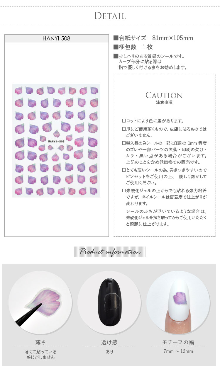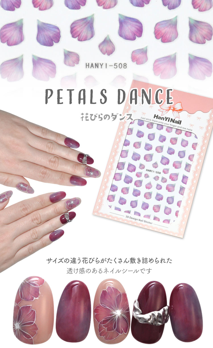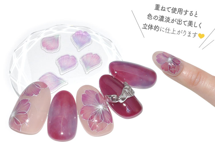 | petals dance 花びらのダンス サイズの違う花びらがたくさん敷き詰められた透け感のあるネイルシールです 重ねて使用すると色の濃淡が出て美しく立体的に仕上がります -------------------------------------- 薄さ:薄くて貼っている感じがしません 透け感:あり モチーフの幅:7mm〜12mm | |