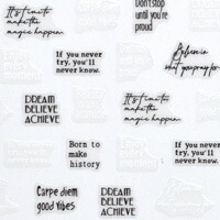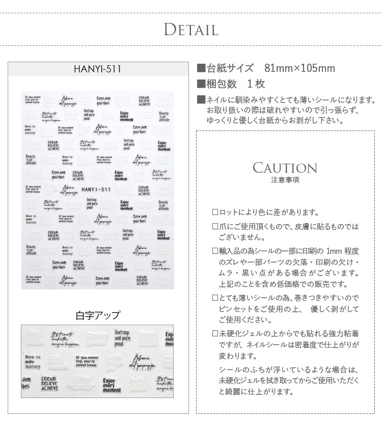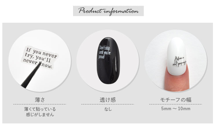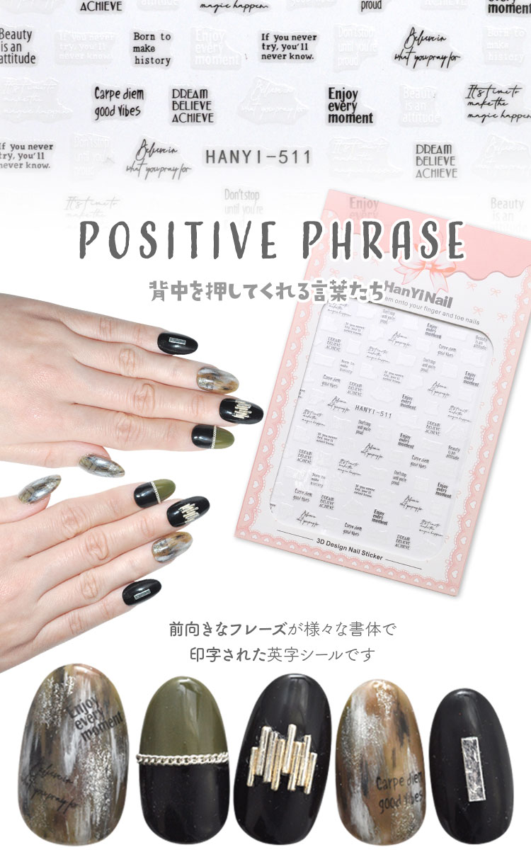 | Positive phrase 背中を押してくれる言葉たち 前向きなフレーズが様々な書体で印字された英字シールです クールなワンポイントとして違う字体を組み合わせて仕上げました -------------------------------------- 薄さ:薄くて貼っている感じがしません 透け感:なし モチーフの幅:5mm〜10mm | |
