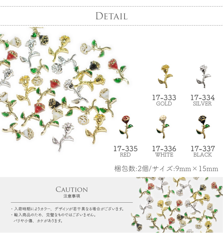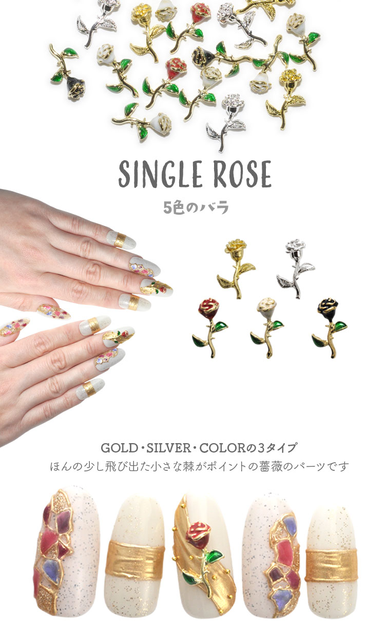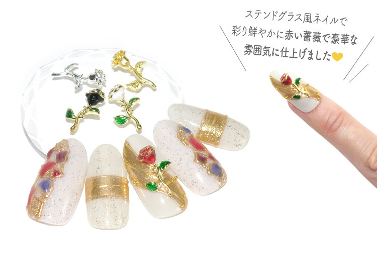 | single rose5色のバラ GOLD・SILVER・COLORの3タイプ ほんの少し飛び出た小さな棘がポイントの薔薇のパーツです ステンドグラス風ネイルで彩り鮮やかに赤い薔薇で豪華な雰囲気に仕上げました | |