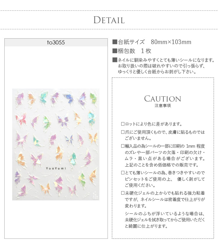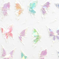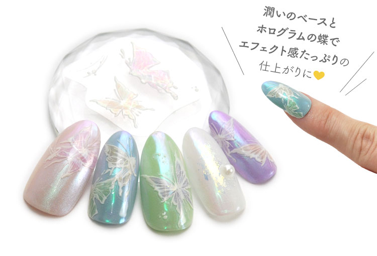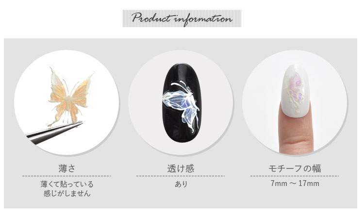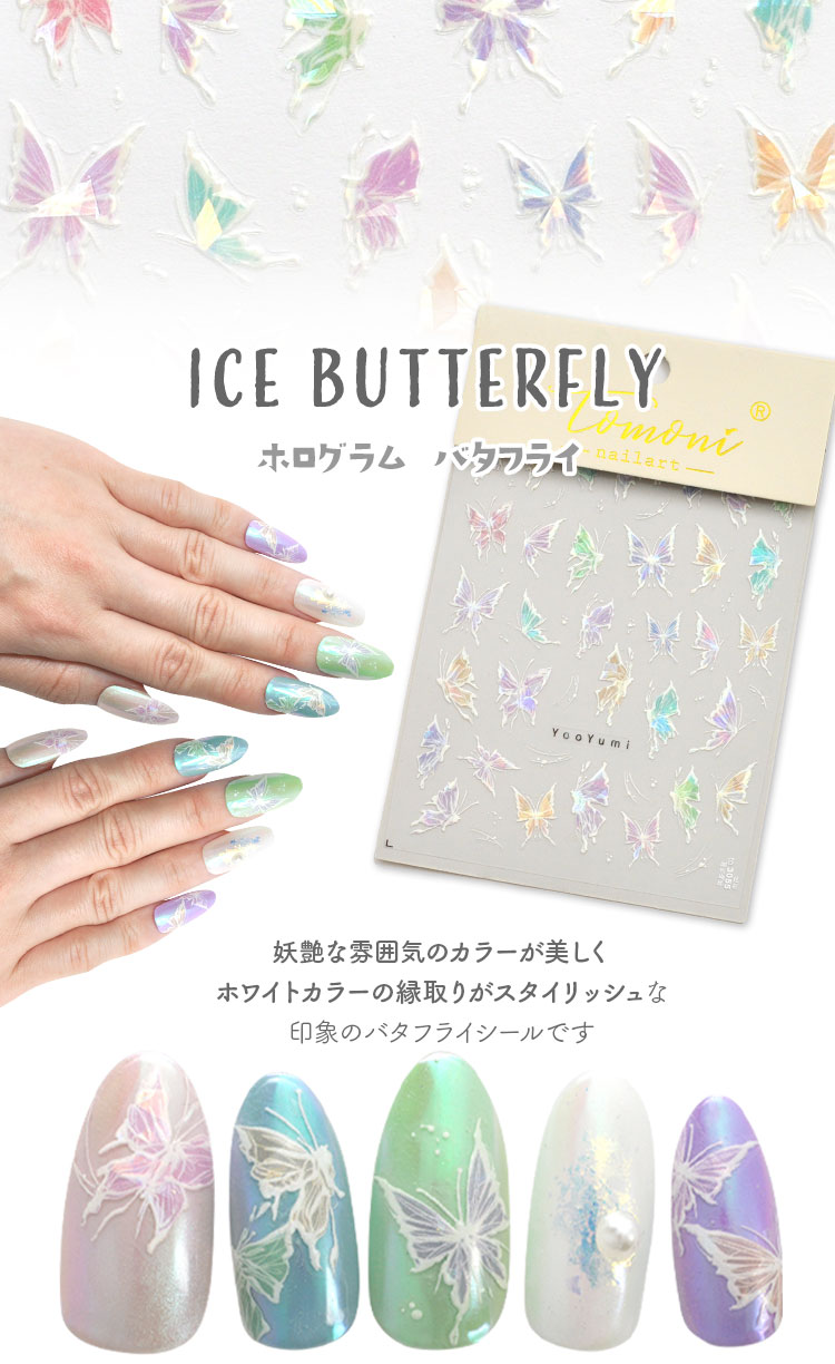 | ICE Butterfly ホログラム バタフライ 妖艶な雰囲気のカラーが美しくホワイトカラーの縁取りがスタイリッシュな印象のバタフライシールです 潤いのベースとホログラムの蝶でエフェクト感たっぷりの仕上がりに -------------------------------------- 薄さ:薄くて貼っている感じがしません 透け感:あり モチーフの幅:7mm〜17mm | |