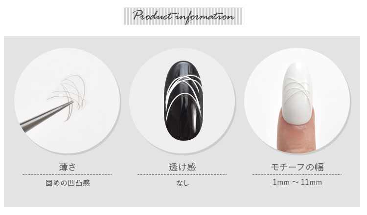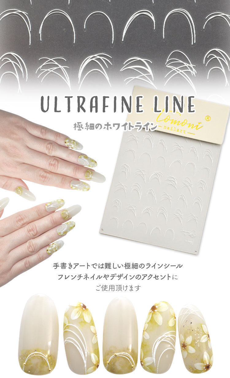| ultrafine line 極細のホワイトライン 手書きアートでは難しい極細のラインシールフレンチネイルやデザインのアクセントにご使用頂けます さり気ないラインのアクセントがポイント!ナチュラに仕上げました --------------------------------------- 薄さ:固めの凹凸感 透け感:なし モチーフの幅:1mm〜11mm | |