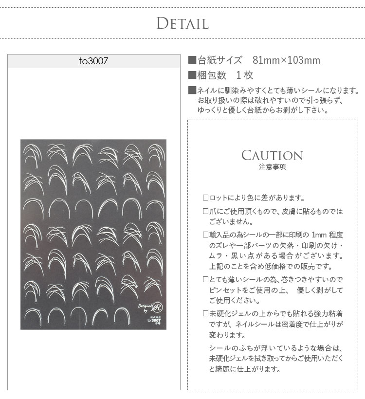 | ・ロットにより色に差があります。 ・シールの一部に印刷のズレ、ムラ、歪み、剥がれ、黒い点がある場合がございます。 ・とても薄いネイルシールのため、巻きつきやすいです。ピンセットをご使用の上、やさしく剥がしてご使用ください。 ・未硬化ジェルの上からでも貼れる強力粘着ですが、ネイルシールは密着度で仕上がりが変わります。 シールのふちが浮いているような場合は、未硬化ジェルをふき取ってからご使用いただくと綺麗に仕上がります。 | |