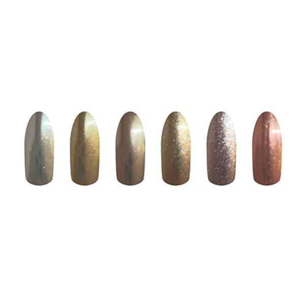 上品かつ華やかな輝きを放つ全6色入り。リリージェル・キラキラノンワイプトップジェルを15〜20秒ほど硬化し、付属のチップを使用しパウダーを爪の上にのせ、優しくこすってください。