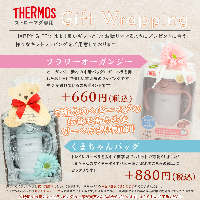 フラワーオーガンジーとくまちゃんバッグのラッピングは、TERMOS製マグが対象です。