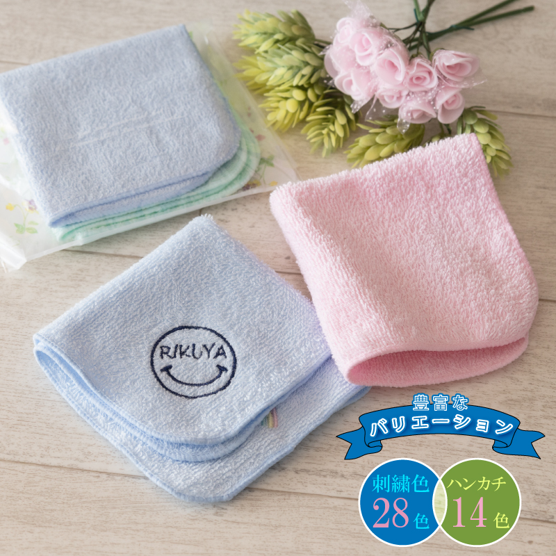 ◇◇名入れ タオルハンカチ 綿100% 約20×20cm 5色 (スマイル2)◇◇
