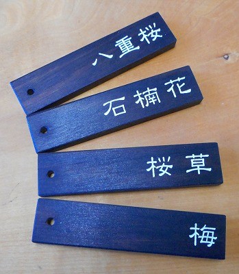 黒檀の木のルームキー。部屋名などをレーザー彫刻し、色付けます。
