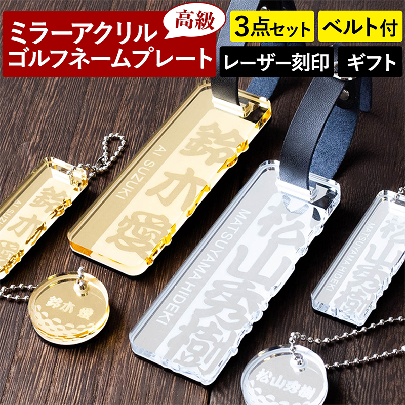 | プレミアムミラー ゴルフ ネームプレート 和風文字 大小プレート ボール型 キーホルダー 3点セット ベルト付 名入れ 刻印 ネームタグ |