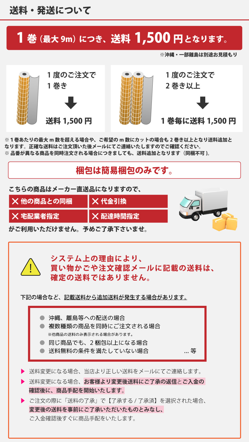 | 備 考 | ご注文は10cm=1個単位でのご注文となります。(横幅は固定になります。) ※例:1mを購入したい場合は、商品個数に10個と入力下さい。 ※デジタル画像の為、画面上の色と商品の色は多少異なる場合があります。予めご了承下さい。 |