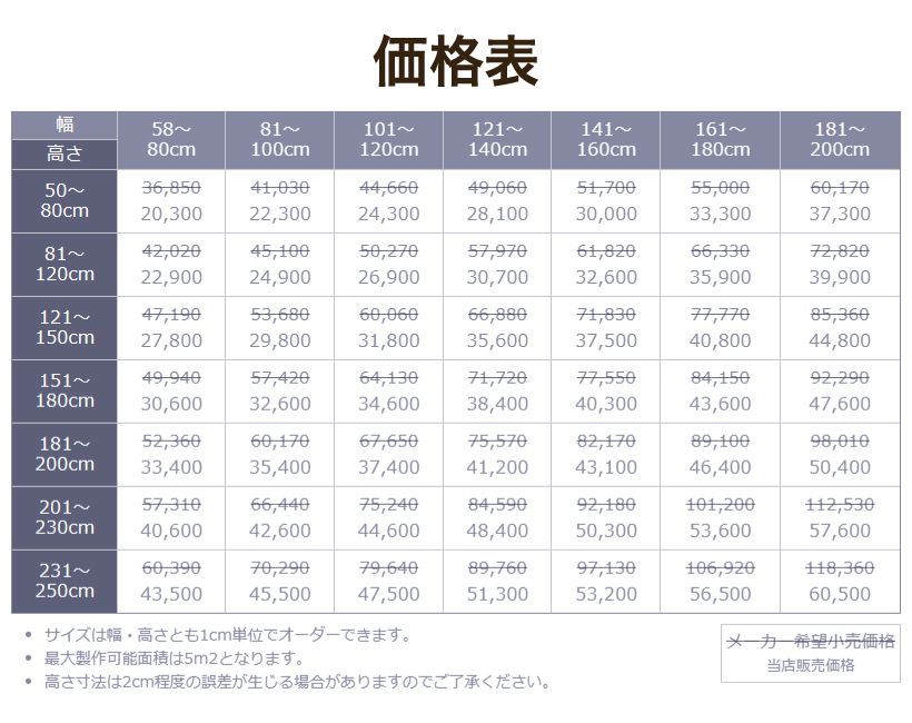 ご希望のサイズの価格や製作可否は価格表をご確認ください。