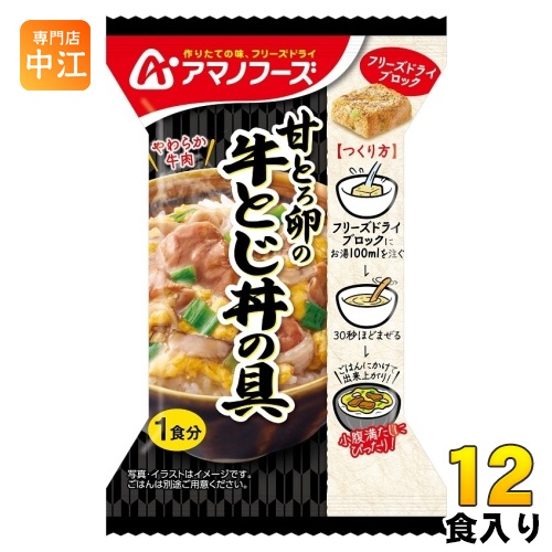 お湯を注ぐだけで出来る小腹満たしにぴったりな牛とじ丼の具、とろっとした卵とやわらかく下茹でした牛肉入り、2種類の醤油とみりんを使った甘だれのやさしい味わい。